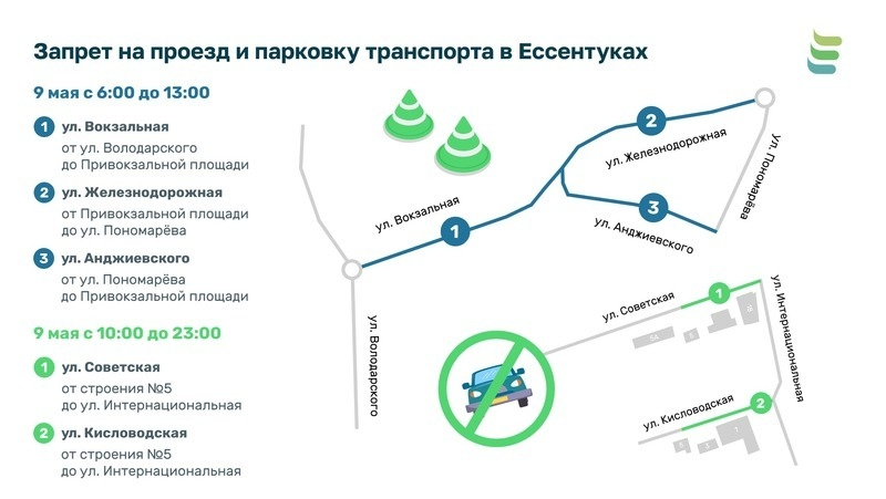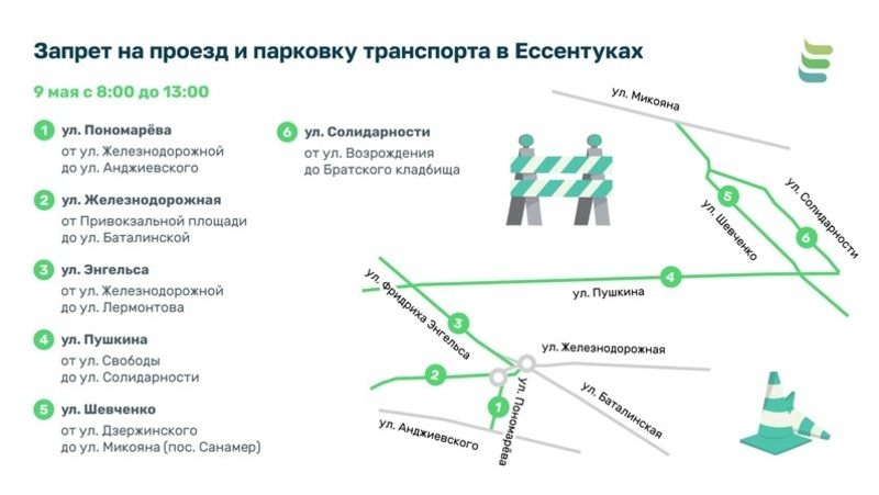 9 мая с 8:00 до 13:00 не будет проезда по улице Пономарёва от Железнодорожной до Анджиевского, по улице Железнодорожной от Привокзальной площади до Баталинской, по улице Энгельса от Железнодорожной до Лермонтова, по улице Пушкина от улицы Свободы до улицы Солидарности, по улице Шевченко от улицы Дзержинского до улицы Микояна посёлка Санамер Предгорного округа, по улице Солидарности от улицы Возрождения до Братского кладбища.