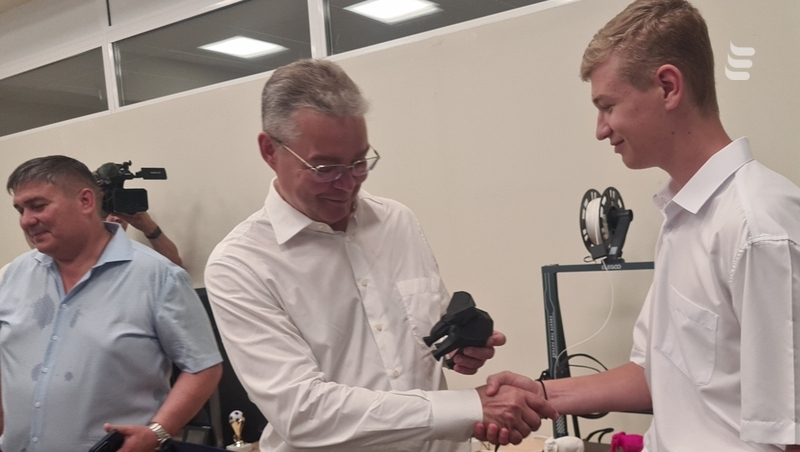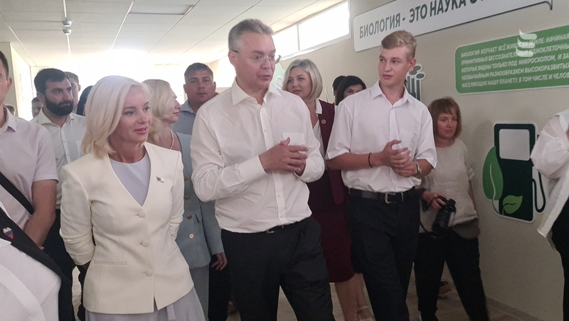 Посетил новую школу губернатор Ставропольского края Владимир Владимиров. Глава региона приехал после завершения линейки. Он осмотрел учебное заведение вместе с председателем комитета Государственной Думы по культуре Ольгой Казаковой, главой минобразования края Марией Смагиной и мэром Ессентуков Владимиром Крутниковым. Экскурсию для гостей провёл ученик школы Антон.