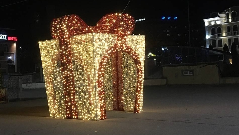 Светятся и другие инсталляции. Одна из них — в виде большого подарка.