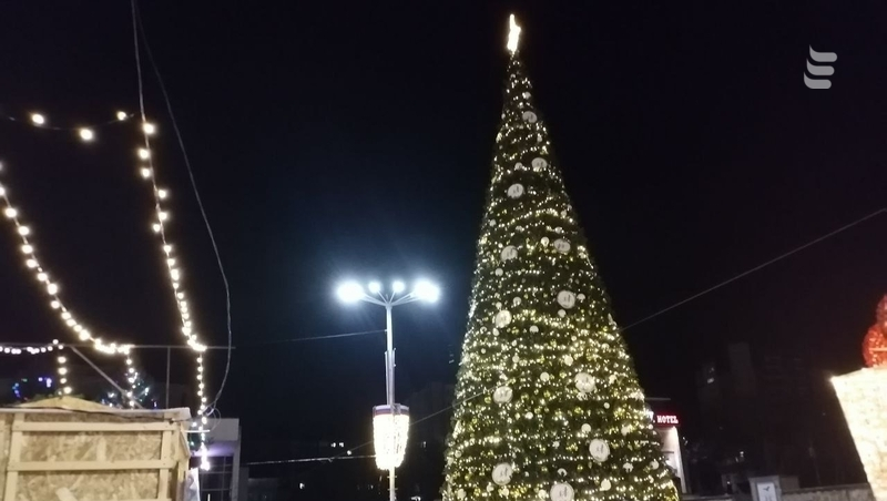 Ближе к вечеру зажигают огни на ёлке на Театральной площади. Она стала самой высокой в регионе КМВ.