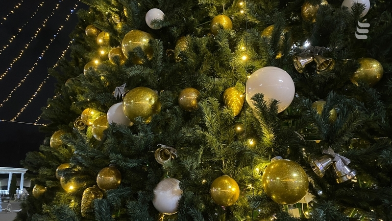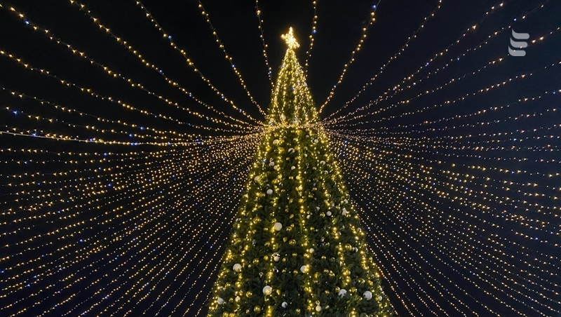 Ёлку нарядили игрушками белого и золотого цветов. Она стоит под переливающимся куполом из гирлянд.