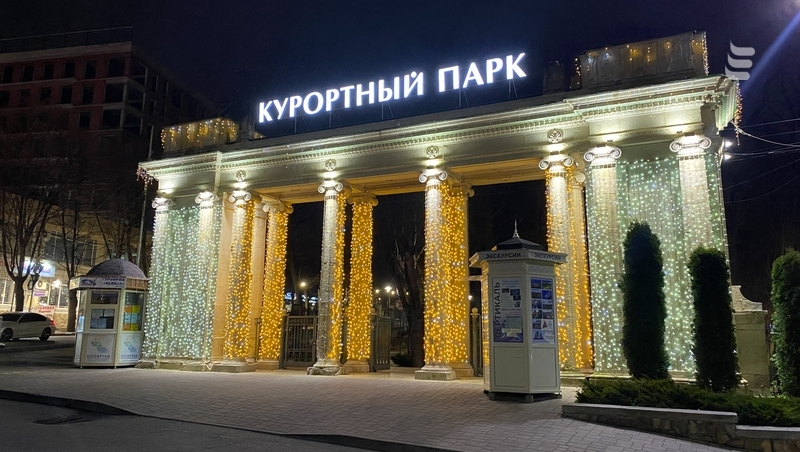 Сияют и колонны у входов в Курортный парк. Не хватает только снега.