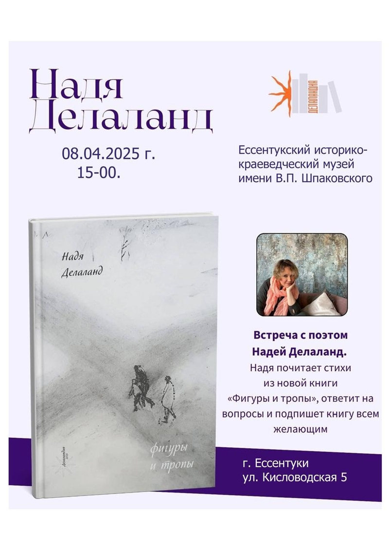 Ессентукский историко-краеведческий музей анонсировал встречу с поэтессой Надей Делаланд, членом Союза российских писателей, которая состоится в ближайшее время.