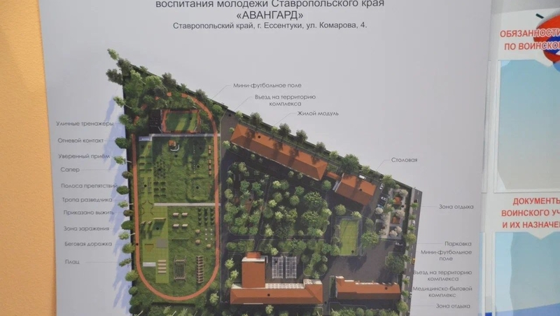 Центр военно-патриотического воспитания молодёжи «Авангард» в Ессентуках займёт почти 3 га. Для спортивной подготовки появятся зоны «Огневого контакта», «Уверенных приёмов», «Сапёра», «Тропа разведчика» и «Зона заражения». Кроме того, здесь будет футбольное поле и волейбольная площадка. В корпусах для юных патриотов предусмотрены аудитории с современным учебным оборудованием, включая мультимедийный тренажёр стрелкового оружия и средств ближнего боя.