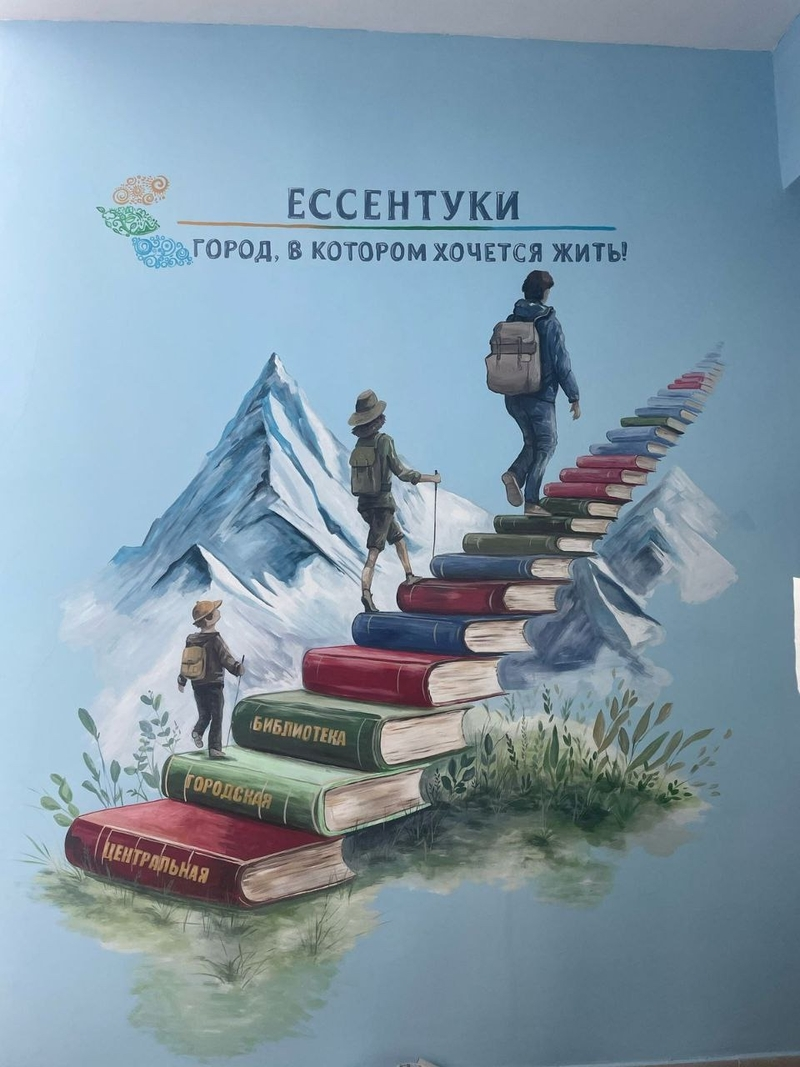 Рукописный мурал теперь есть внутри самой большой библиотеки курорта. На нём изображены книги, по которым идут туристы и надпись «Ессентуки — город, в котором хочется жить!».