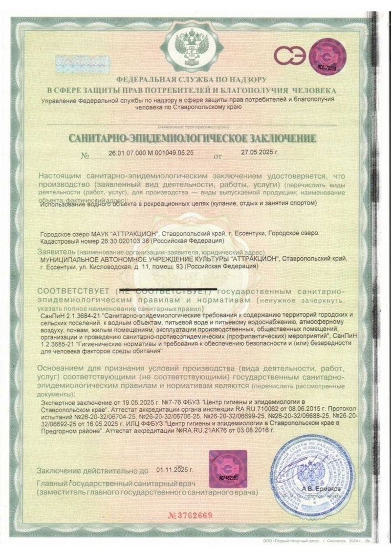 Санитарно-эпидемиологическое заключение, подписанное главным государственным санитарным врачом по Ставропольскому краю, выдали администрации Ессентуков. Оно даёт право начать купальный сезон на курорте на городском озере.