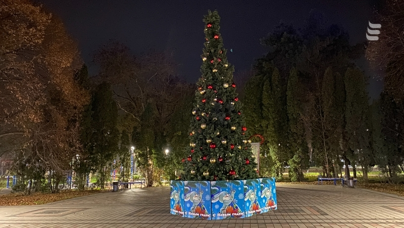 Главный символ Нового года расположили в центре сквера. За ней красуется инсталляция в виде подарка.