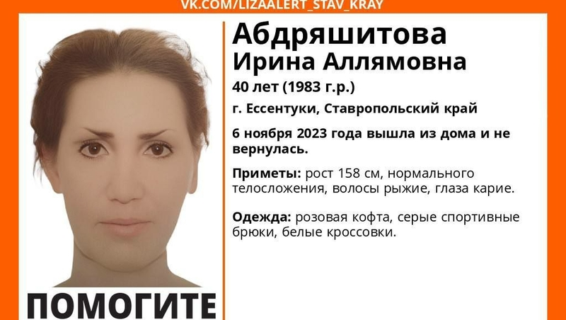 Ирине 40 лет, рост — 158 см, нормальное телосложения. Волосы у женщины рыжие, глаза карие. Одета была в розовую кофту, серые спортивные брюки и белые кроссовки.