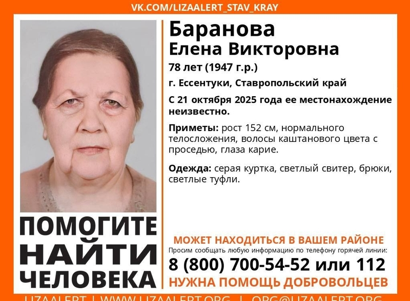 Ессентучанку Елену Баранову 1947 года рождения ищут с 21 октября. Её приметы — рост 152 см, нормальное телосложение, волосы каштановые с проседью, карие глаза. Была одета в серую куртку, светлый свитер, брюки, светлые туфли.