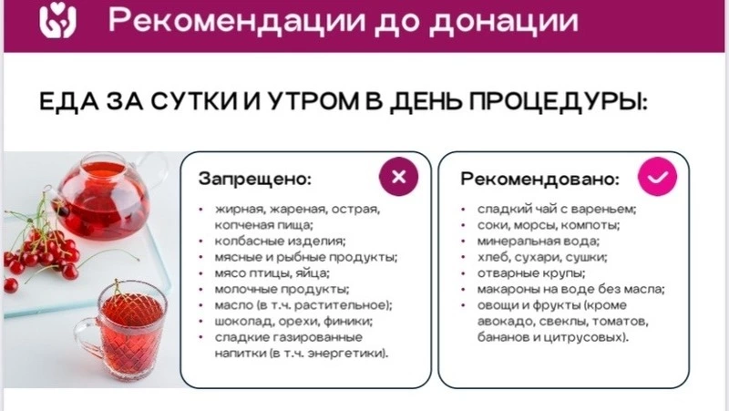 Медики напоминают, что стать донором может любой здоровый человек старше 18 лет и весом не менее 50 кг. За сутки перед донацией рекомендуют придерживаться специальной диеты, а после процедуры уделить внимание восстановлению организма.